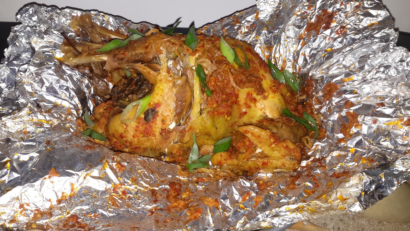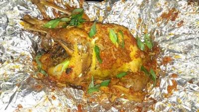 Tusuk ayam dengan garpu biar nanti bumbu bisa meresap, lalu oles merata bumbu nya dan masukkan daun singkong ke dalam perut ayam. Bungkus dengan daun pisang karena saya gak ada daun pisang jadi nya pakai alumunium foil saja :) lalu kukus selama satu setengah jam ( saya pakai presto kira2 45menit setelah panci presto mendesis ). Setelah agak dingin dalam keadaan masih terbungkus masukkan ayam ke dalam oven, panggang selama 10-15 menit dengan suhu 200'c.